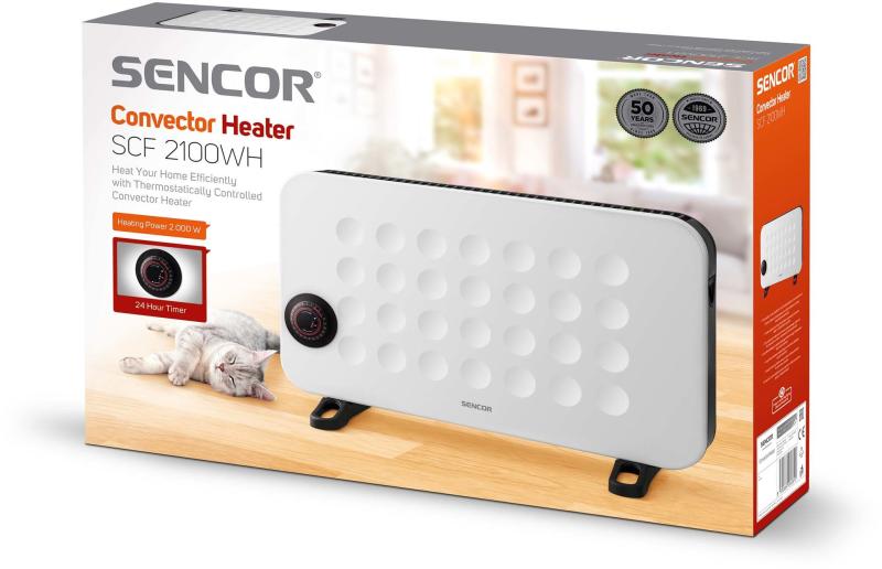 A Sencor SCF 2100WH egy elektromos forrólevegős konvektor, amelynek maximális teljesítménye akár 2000 W. Három választható fűtési teljesítmény szinttel, folyamatos hőmérsékletszabályozó termosztáttal és bekapcsolást jelző fénnyel lett felszerelve. A biztonságos működésről a beépített túlhevülés elleni védelemi rendszer gondoskodik. Ideális választás akár 25 m2 terek, egyenletes fűtésére a meleg levegő elosztására. A gyártáskor felhasznált anyagok, kiváló minőségűek, valamint az elegáns megjelenésének köszönhetően egy modern belső térben is helyt állnak.
